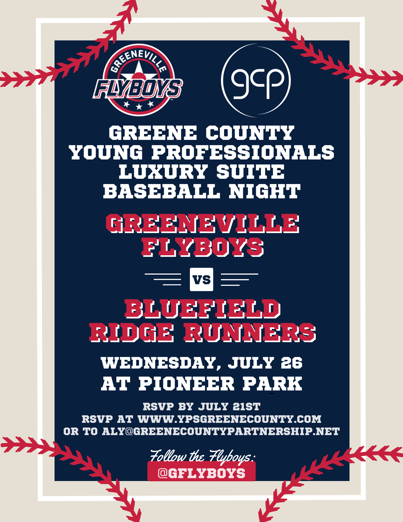 Join other young professionals from the area in a luxury suite at the Greeneville Flyboy's game against the Bluefield Ridge Runners. Suite tickets are limited to one per person and can be picked up at will call on the day of the game. Space is limited and you must RSVP below to guarantee your ticket.